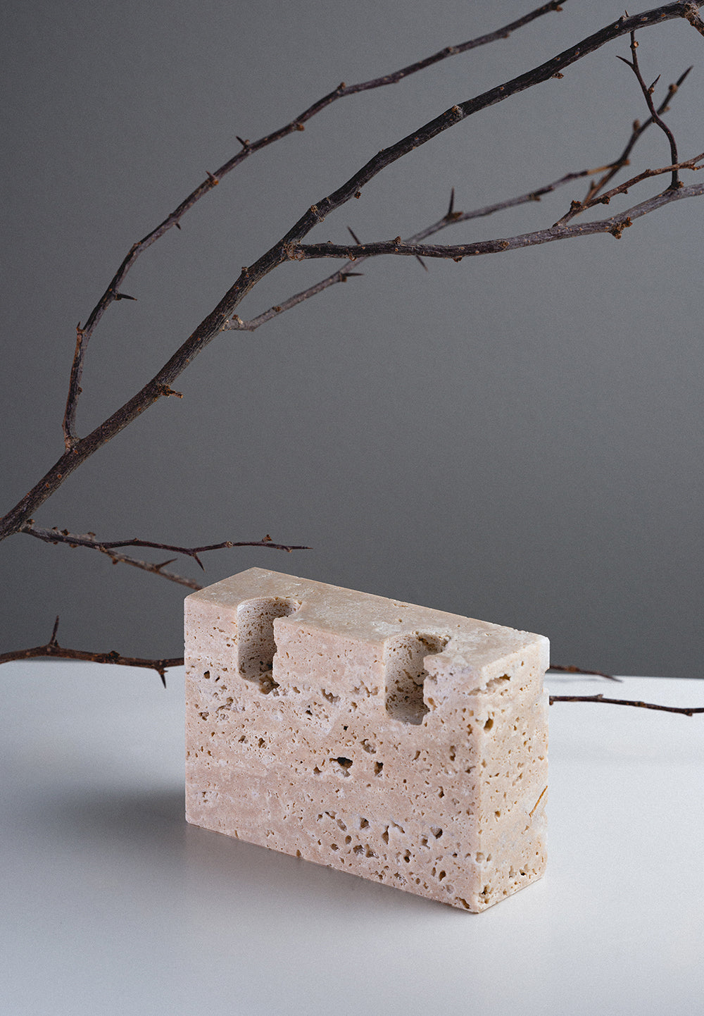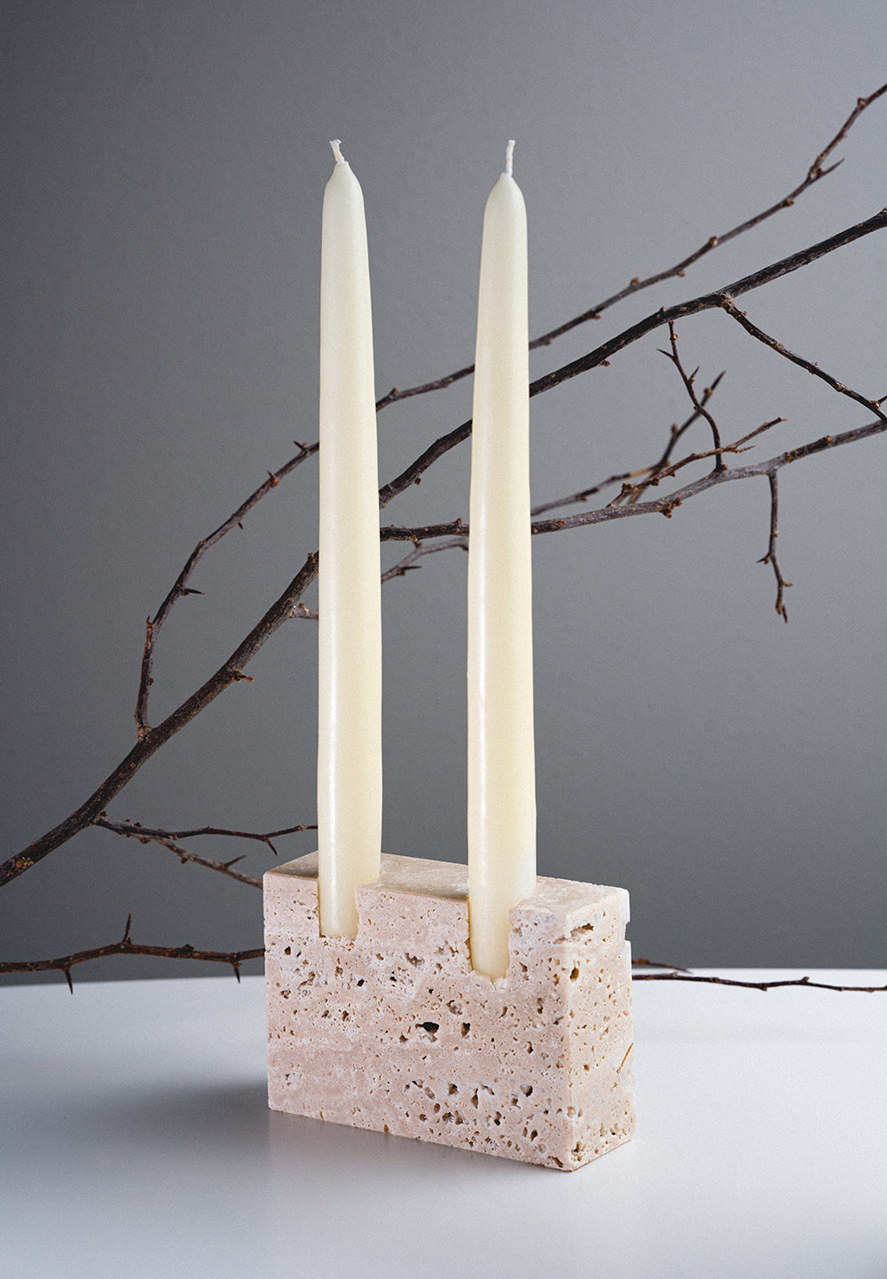 Discover our elegant handcrafted holder, fashioned from natural stone- beige travertine with two inserts for candles.