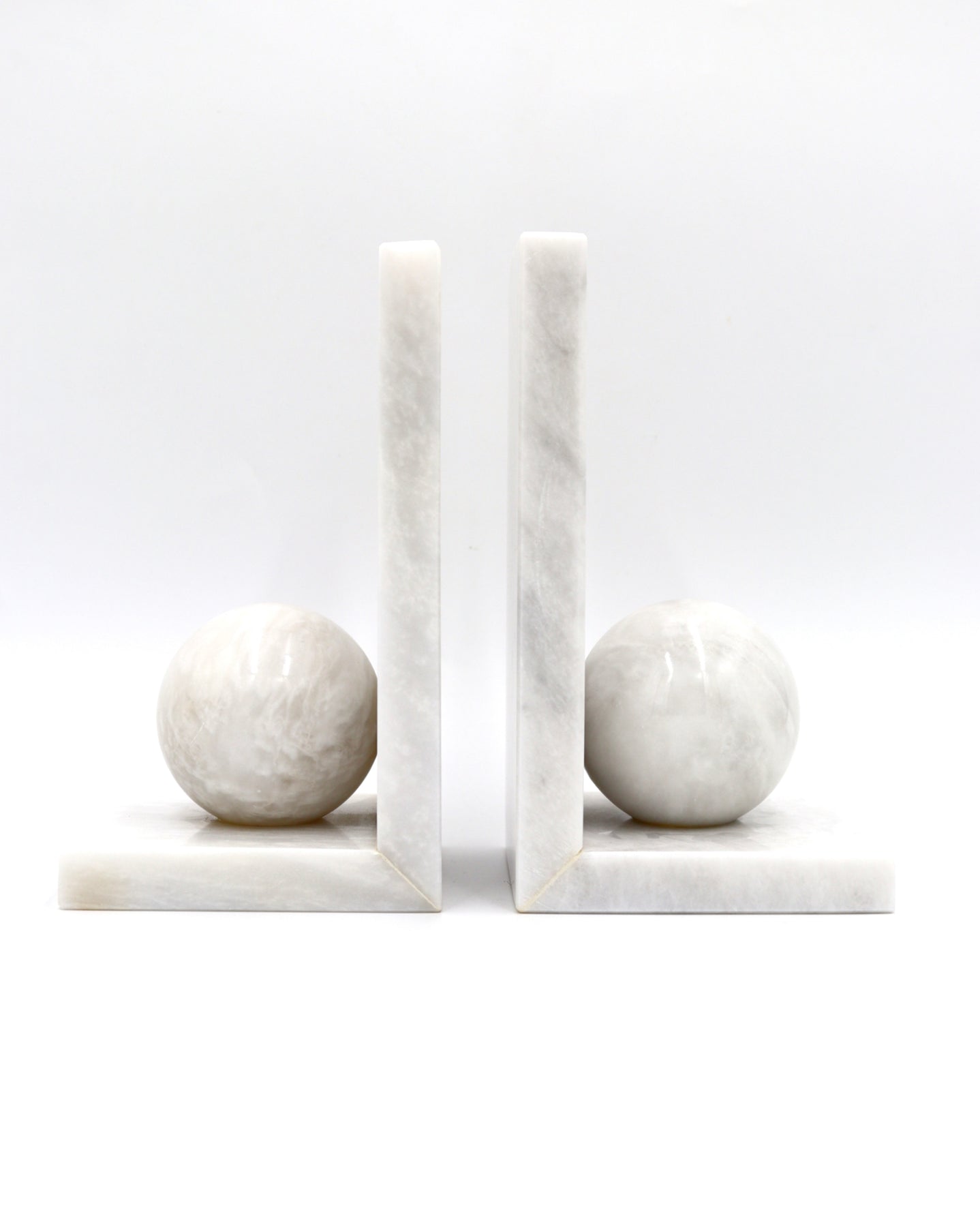 Šie masyvūs Carrara marmuriniai knygų laikikliai – puikus derinys elegancijos ir funkcionalumo. Marmuras garsėja savo balta spalva, pilkšvais venavimais ir natūraliais variacijų raštais, todėl kiekvienas laikiklis yra visiškai unikalus. Centre įkomponuotas gaublys kontrastuoja su švaria pagrindo struktūra, suteikdamas subtilaus žaismingumo ir stiliaus akcentą.