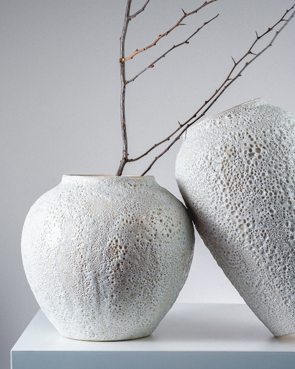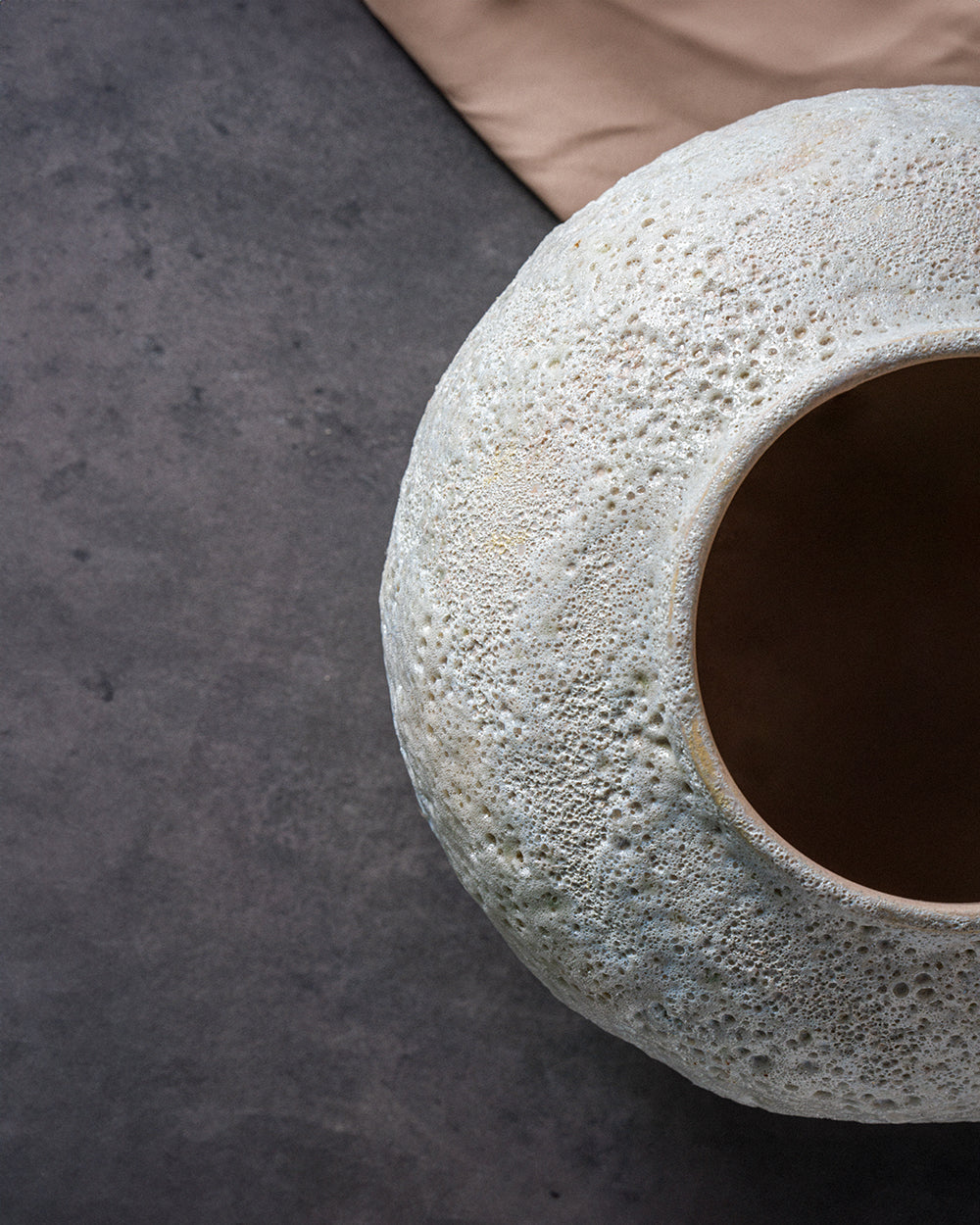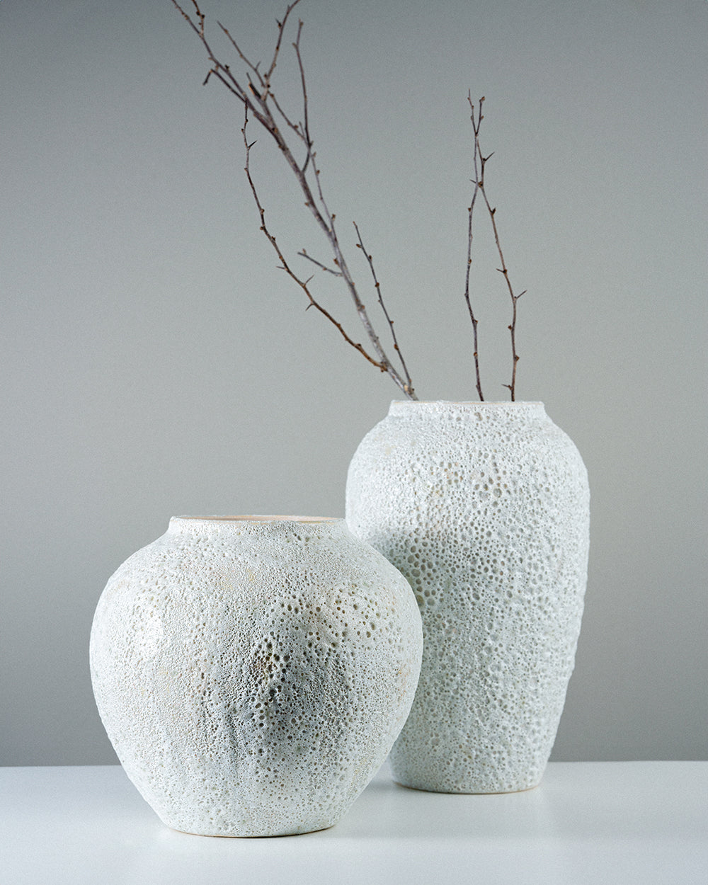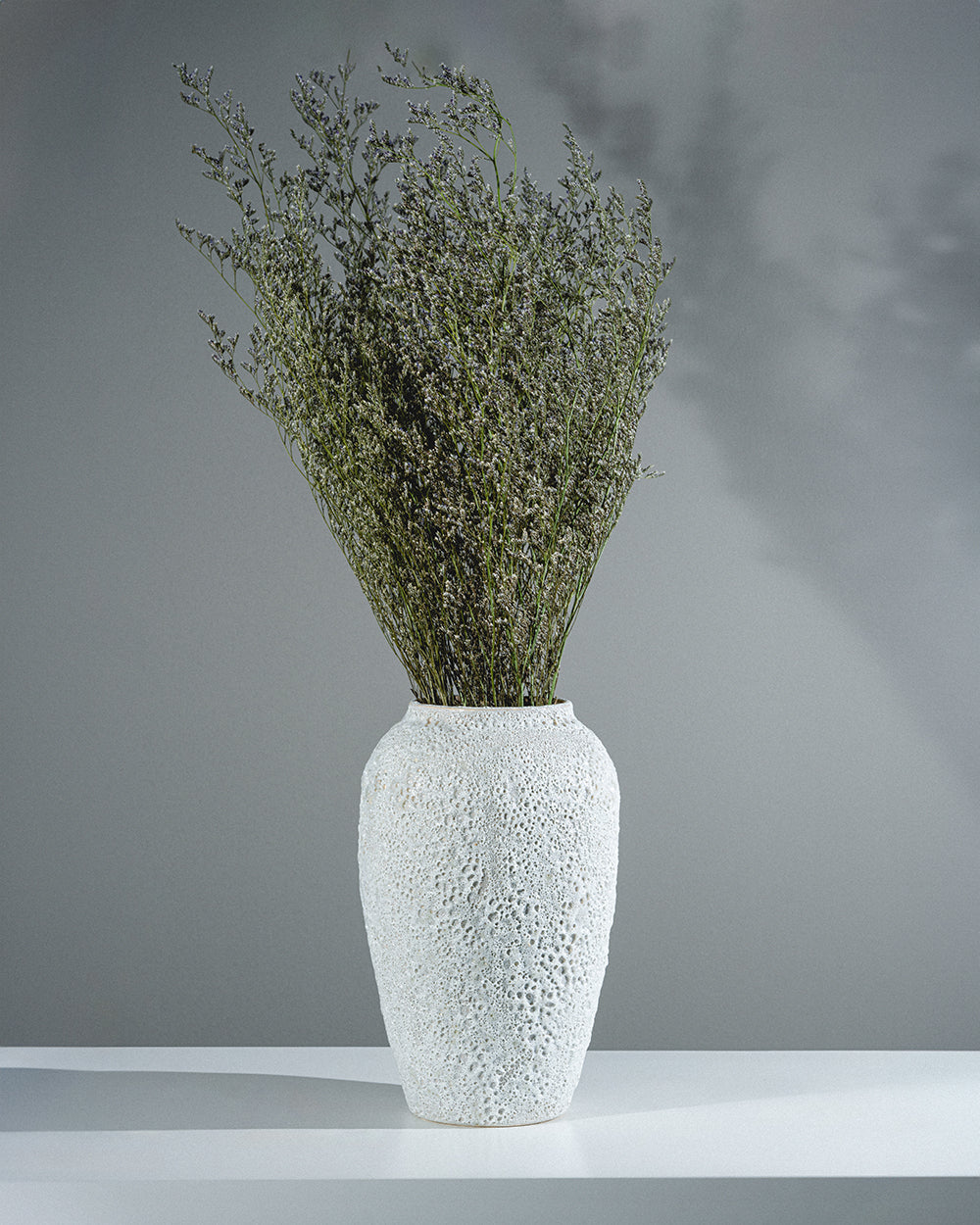 Embracing a charming, dimpled shape, the Cora Vase brings to mind both ancient artistry and distant landscapes that spark curiosity. Taking cues from the beauty of prehistoric pottery, a volcanic white glaze is thoughtfully added, giving this earthenware a fresh and captivating visual twist. With its gently rounded top, softened edges, and subtly tapered base, it offers a friendly touch to the natural material. Whether you're showcasing dried, faux, or fresh flowers, the Cora Vase is your versatile companion, blending style and warmth with every arrangement.