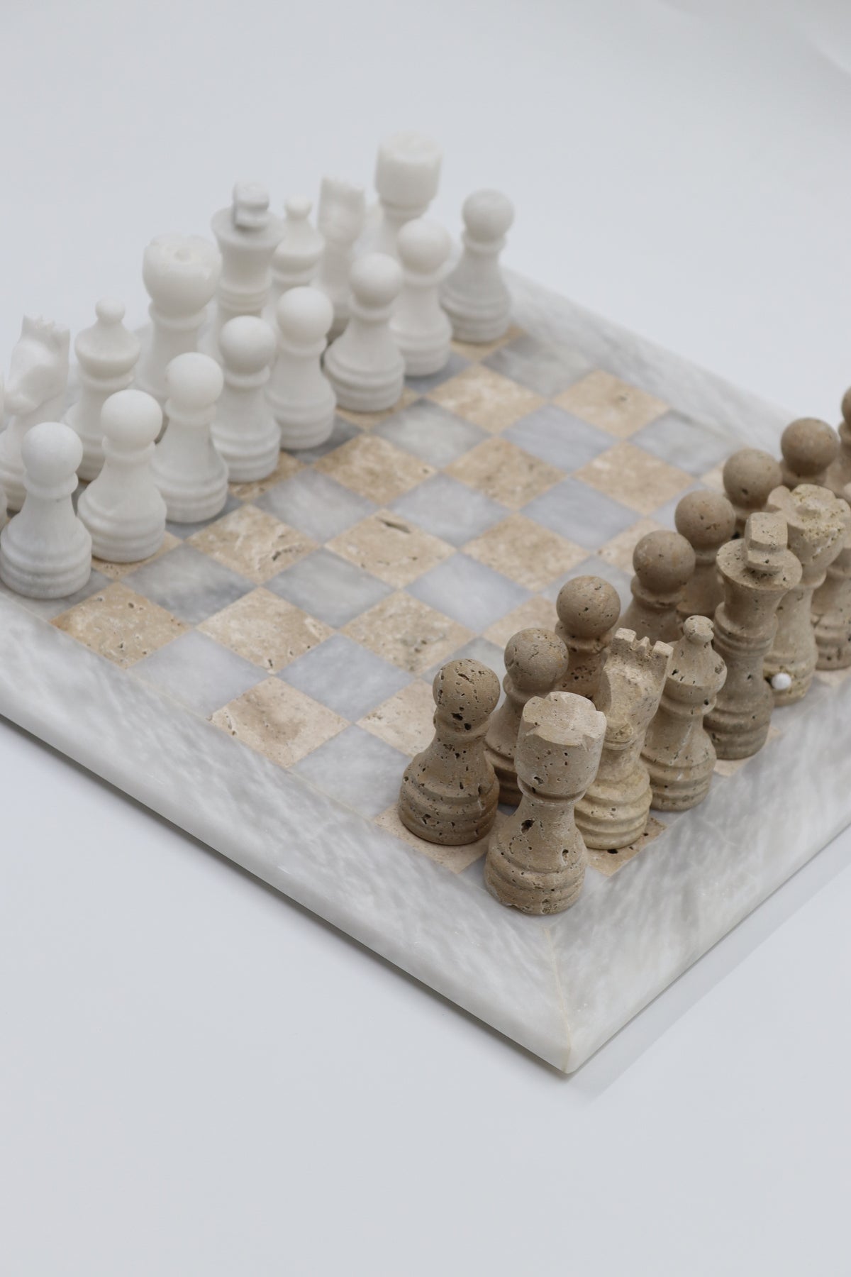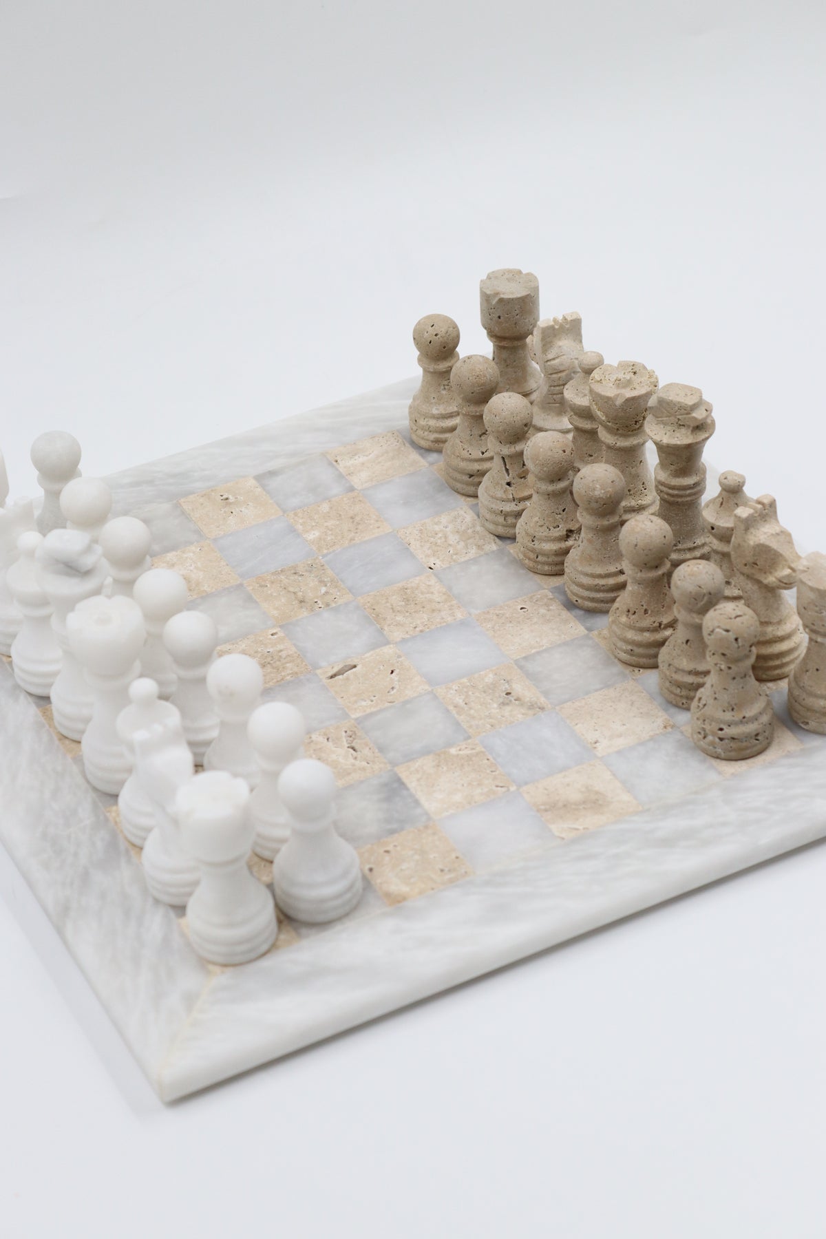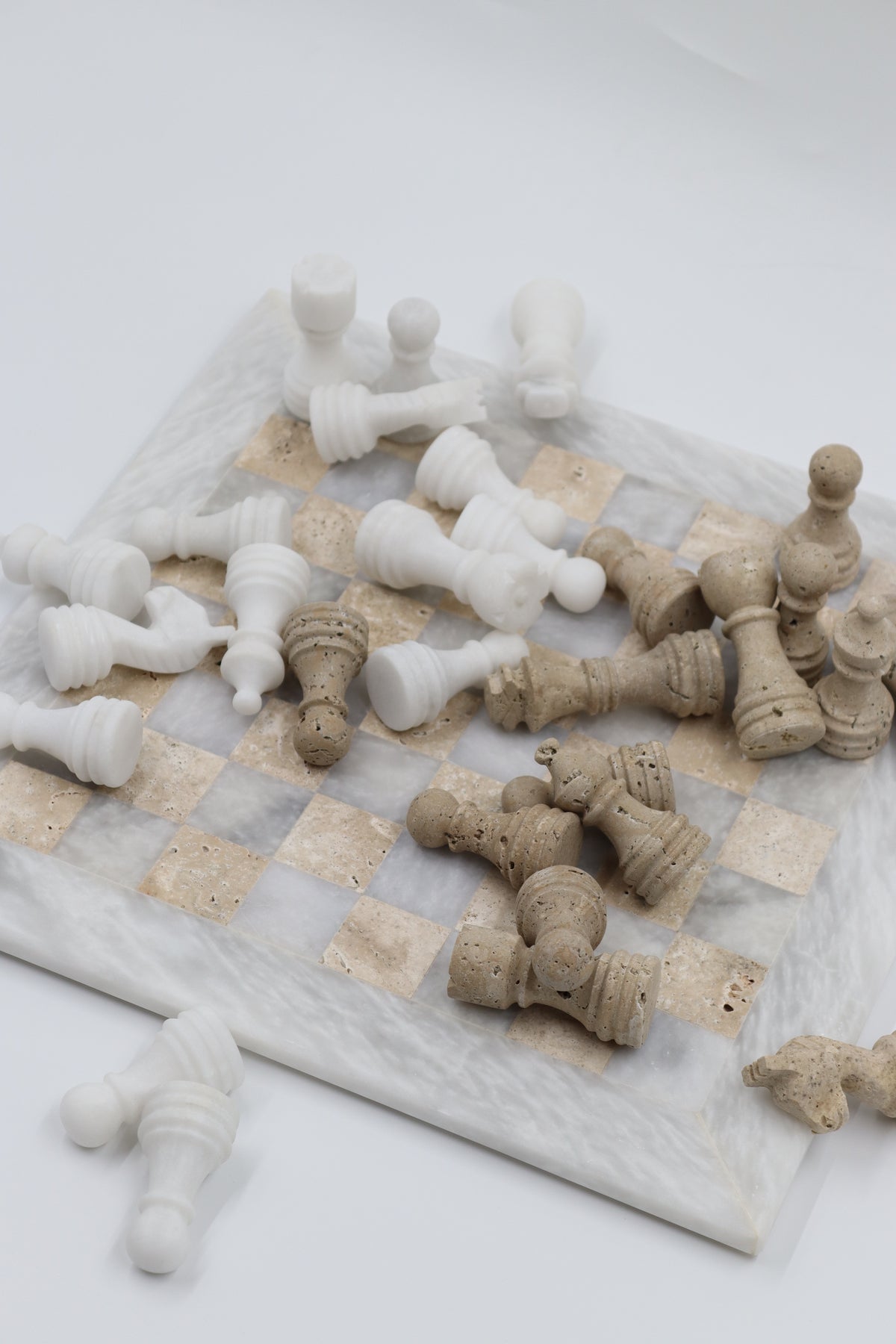 This handcrafted marble chess set is where timeless design meets refined craftsmanship. Featuring a polished marble board in soft grey and beige tones, it’s paired with sculpted natural stone pieces in classic white and taupe. Each piece is uniquely carved, highlighting the raw beauty and texture of real stone—no two sets are alike.