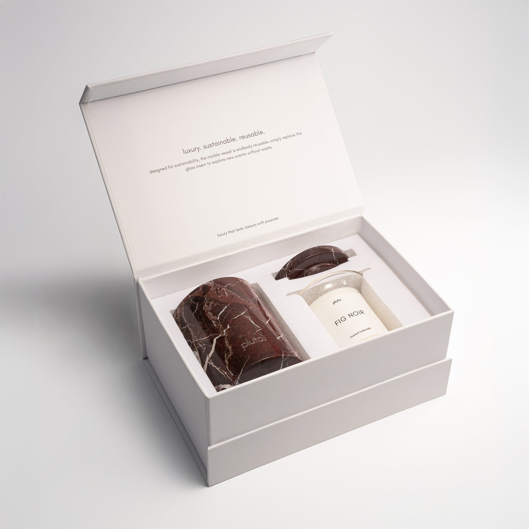 Paired with a matching marble lid and a clean-burning soy candle insert, this set is designed for both visual impact and sustainable function. Once the candle is finished, simply replace the insert to enjoy new scents without creating waste — the marble holder is made to last a lifetime.